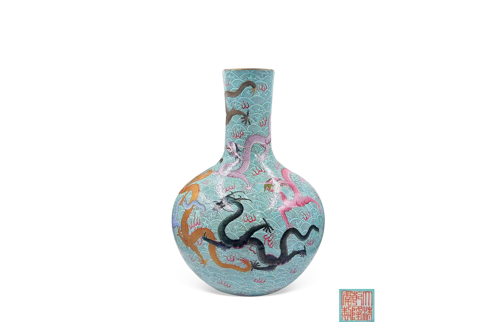 green ground famille rose 'dragon and waves' globular vase with cylindrical neck qianlong six-character sealmark