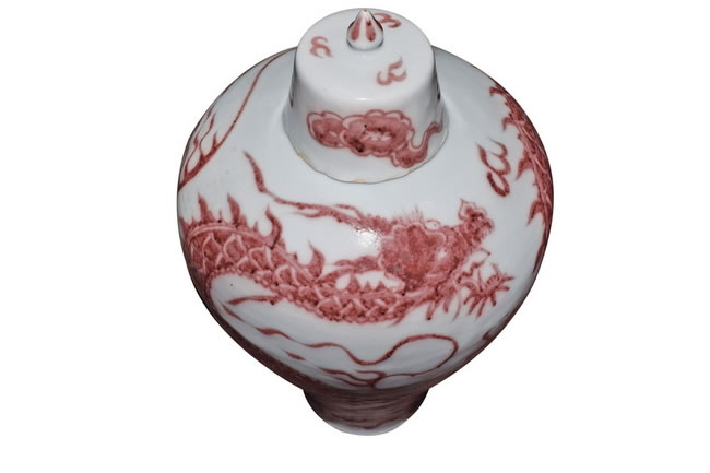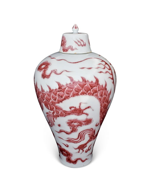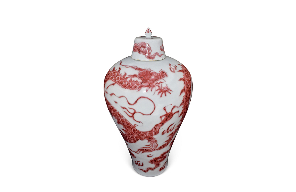 规格: h. 48.5 cm md. 5 cm bd. 13.7 cmunderglaze copper-red 'dragon' prunus vase and cover, meiping yuan dynasty