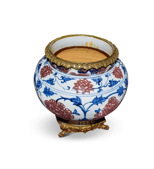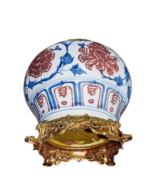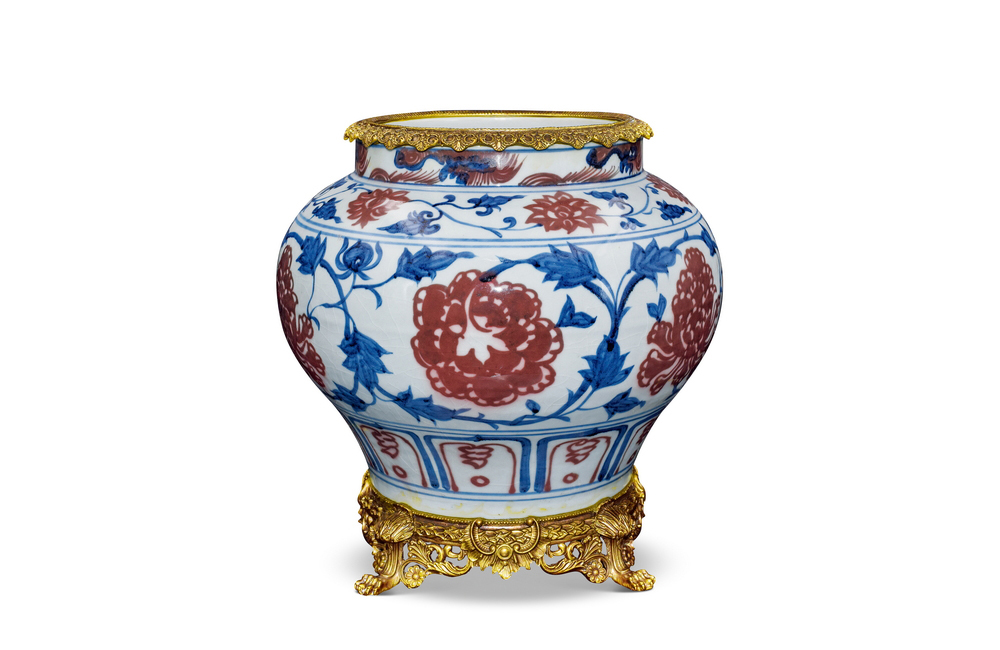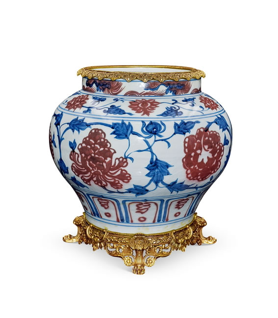 规格: h .33.2 cm md. 23 cm bd. 30 cmlarge blue and white underglaze copper-red 'interlocking peony' jar yuan dynasty