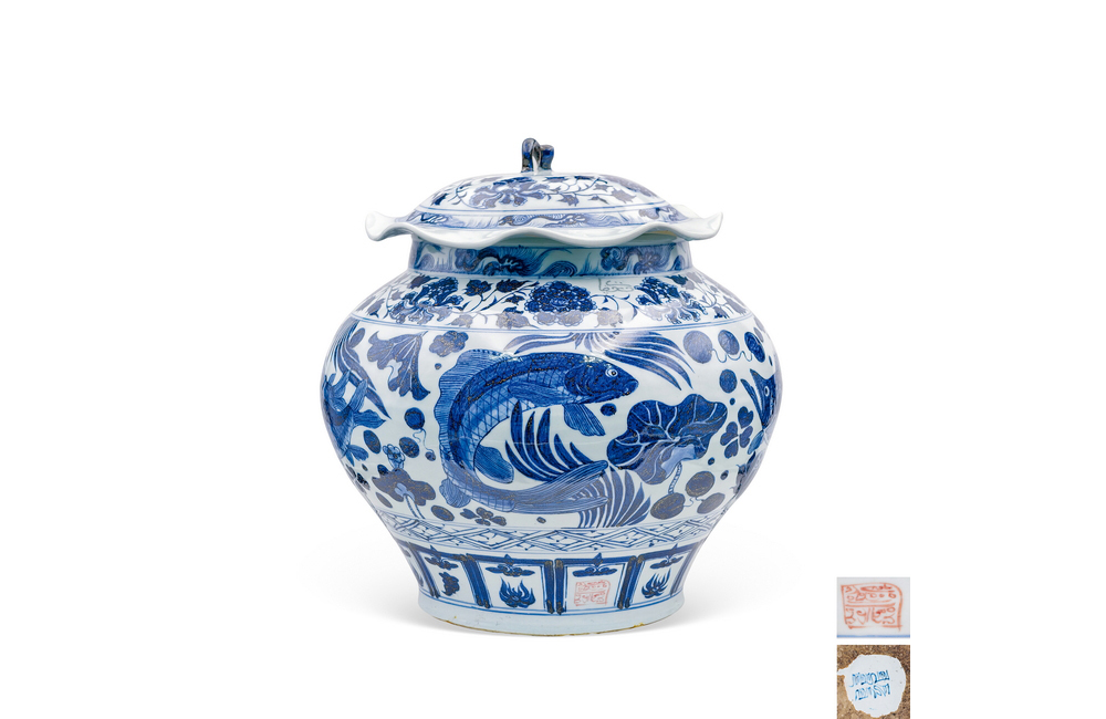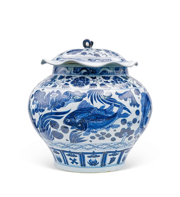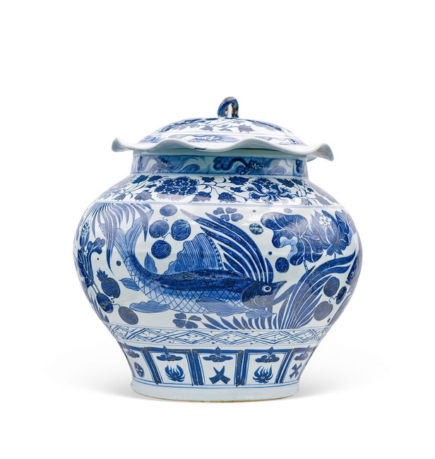 large blue and white 'waterweeds' jar and lid yuan dynasty