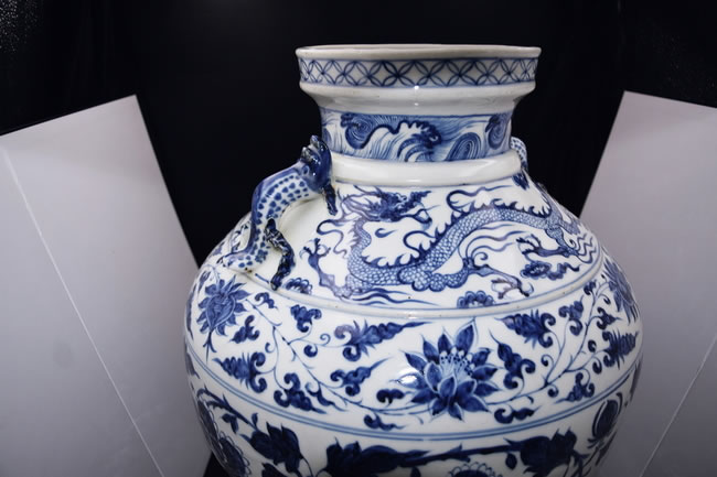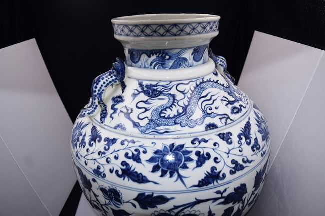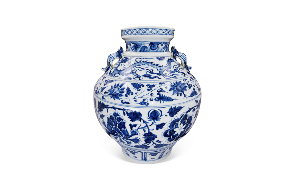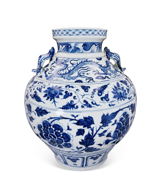 large blue and white 'two dragons and peony' jar yuan dynasty