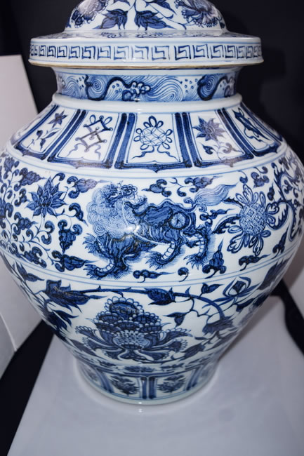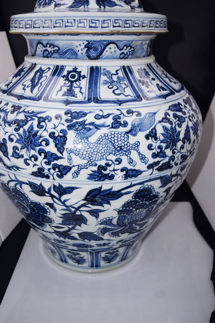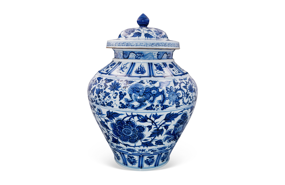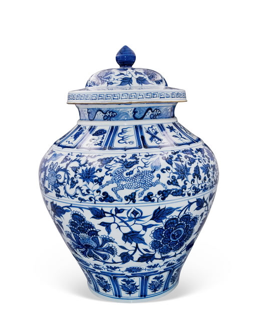 blue and white 'kylin and peony' jar and lid yuan dynasty