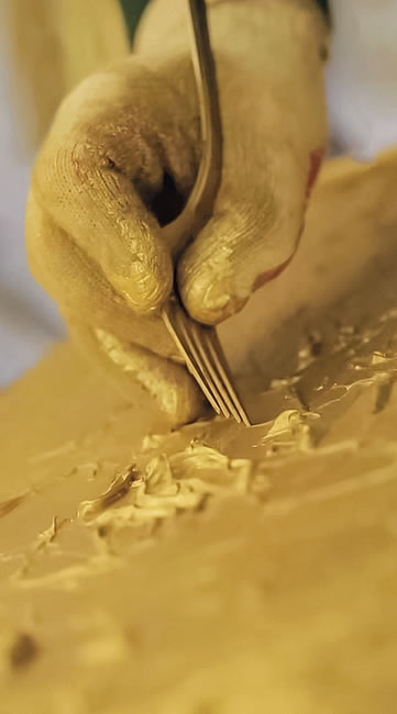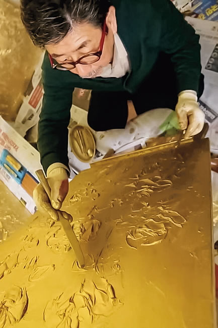金一泰,作为韩国当代艺术家,与奥地利著名艺术家金箔艺术作品作者古斯塔夫·克里姆特有着同样的热情。但与他不同的是,金一泰并非用金箔来做艺术品的表面装饰,金一泰是以99%的24k 纯黄金直接作为其艺术品的原料。24k 金是最纯的金子,相等于每千克黄金含纯度999 克。自1998 年起进行研究和实验,耗尽7 年时光,苦尽甘来,7 年里,金一泰共卖掉两栋房子并耗资30 亿韩元(约1800 万人民币),终于找到了绘画与雕刻24k 黄金的独门秘方和技术。自古以来,没有哪位艺术家能做到这般境界,可以说,他把黄金艺术提升到了一个全新的高度,开创了一道前无古人,后无来者的道路。金一泰之所以那么执着于原材料的选择,是因为他想要把这些黄金艺术品永远的保存与传承下去。他的作品不会随着时间褪色、破裂或变质。